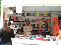 Ayer, por arte de magia, la Domadora de Elefantes se convirtió en el Hada de los Cuentos y apareció en la Feria del Libro de Madrid acompañada del muy charlatán y travieso Mono Lolo para mostrarles a los niños que se acercaban a la caseta de Amargord las últimas peripecias ilustradas de este singular primate. María Espejo –la ilustradora del cuento que narra las aventuras de Mono Lolo– no quiso perderse la reunión, y llegó cargada de globos de colores que ella misma había convertido en un montón de monos trepadores de palmeras. Entre la ilustradora que lo llenó todo de animales a golpe de dibujo, la escritora a la que el estreno le había puesto mariposas en el estómago (y, en general, en todo el cuerpo), el personaje que se subía por las paredes y la tropa de micos multicolor que escalaban las palmeras de aire, la caseta se convirtió en toda una prueba para la paciencia de Blanca y Rodrigo que, diligentes, intentaban mantener el orden y atender a los clientes. También demostró su infinita paciencia Javier Torrente, autor de “La pascua rusa” que esa misma tarde firmaba ejemplares de dicho libro compartiendo espacio con la multitud antes descrita.Muchos amigos y algunos familiares se sacrificaron y dejaron de ver el partido de la selección española de fútbol para pasar por allí a saludar a las autoras y al mismísimo Mono Lolo. Se asomaron a la caseta de Amargord, entre otros, Migue y María José, Eva y Jose, Eva Fernández, las autoras de “Sabia vida savia”, Lamari y sus hermanas, Paco Sevilla, Nuria y Sonia, Julián y Jesús (también conocidos por algunos como Los Dalton), Fran y Adela, la madre de la Domadora de Elefantes y su hermana Isabel (no tiene otra)… y otros que seguro olvido y a los que pido que me perdonen la desmemoria. También estuvo allí el imprescindible Pedro (alias Herodoto) que charló con unos y con otros e hizo algunas fotos y, en un momento dado, se fue a buscar agua desapareciendo por un largo rato; cuando ya se barajaba la opción de poner su foto en los cartones de leche con un “se busca” igual que en las películas americanas, resulta que regresó, curiosamente justo después de que España hubiera ganado por un gol a Suecia.